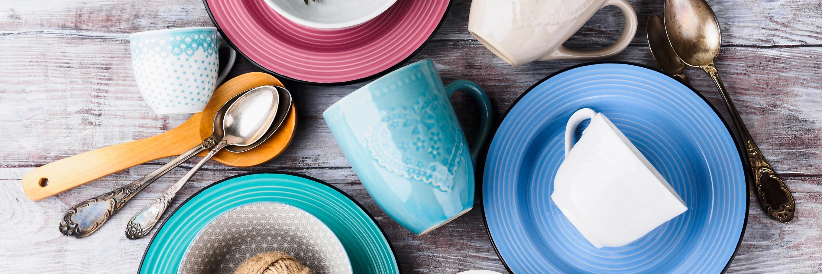 C e r a m i c c r o c k e r y t a b l e w a r e o n w o o d e n b a c k g r o u n d . P a s t e l v i n t a g e c o l o r b o w l s , d i s h e s , c u p s