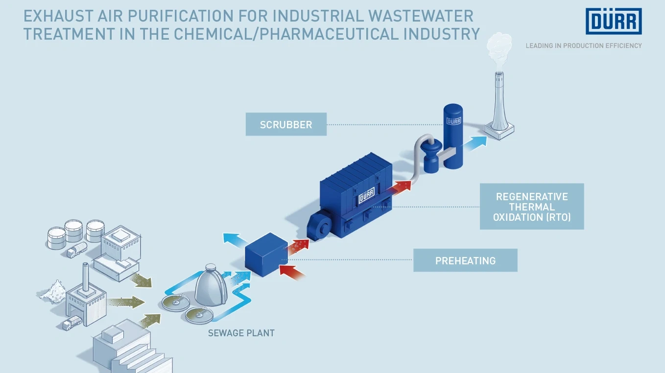 Regenerative thermal oxidation (RTO) is becoming increasingly popular for the treatment of exhaust air from industrial processes. This technology was ideal for ARA Rhein, however with a much more sophisticated technical design for the plant than the one necessary for many other industries. “Waste water from chemical, petrochemical, and pharmaceutical industries typically contains a multitude of hydrocarbons, sulfurous, and inorganic compounds. The exhaust air that escapes from these compounds is highly corrosive and would corrode the materials com-monly used in air pollution control plants and destroy them in the long term,” says Markus Dertinger, Global Customer Director at Dürr. That is why Dürr planned and built a multi-stage Ecopure® RTO system with a corrosion-proof design.