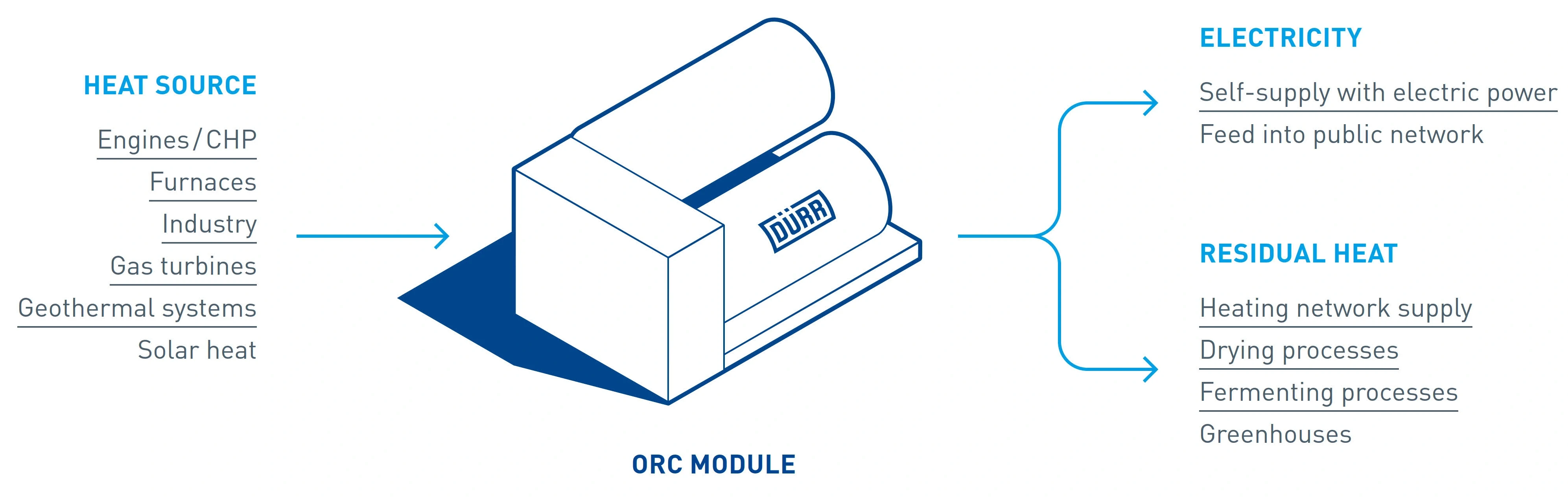 A wide variety of heat sources are suitable for the ORC module. Industrial waste heat, engines, furnaces, biochar, gas turbines, geothermal energy or solar heat can all be used. The electricity generated can be used for self-supply or fed into a public network. In addition, the residual heat can be utilized for local and district heating networks, drying processes, fermentation processes, or greenhouses.